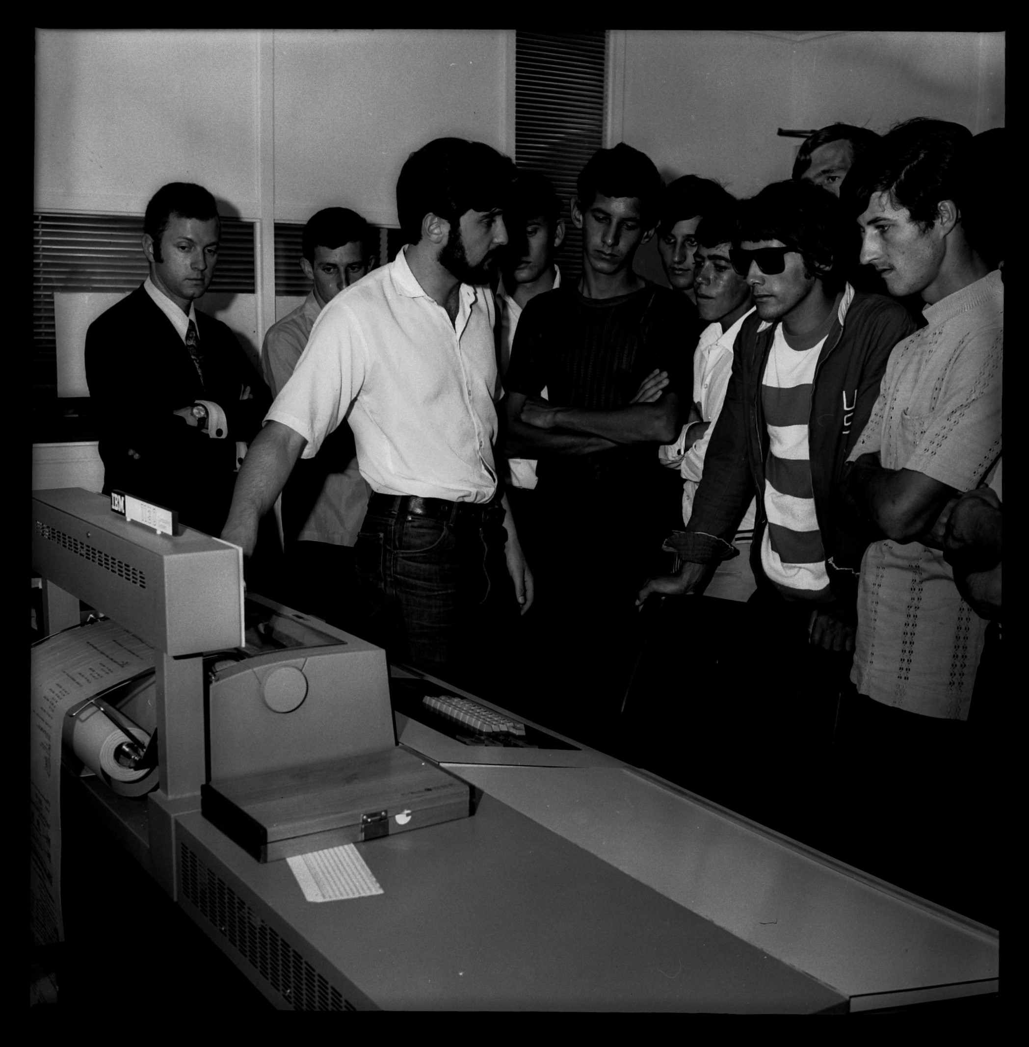 Os alunos do Colégio Agrícola de Araquari estão olhando o computador IBM 1130. O computador está imprimindo algo e a frente dele há um homem de camisa branca demonstrando o funcionamento do computador. Nove alunos estão ao redor do computador observando seu funcionamento. Da esquerda para a direita é, acima do computador há uma placa nas cores preta e branca. Na parte preta está escrito "IBM" e na parte branca está escrito "1130". O aluno de óculos escuro está usando duas muletas.