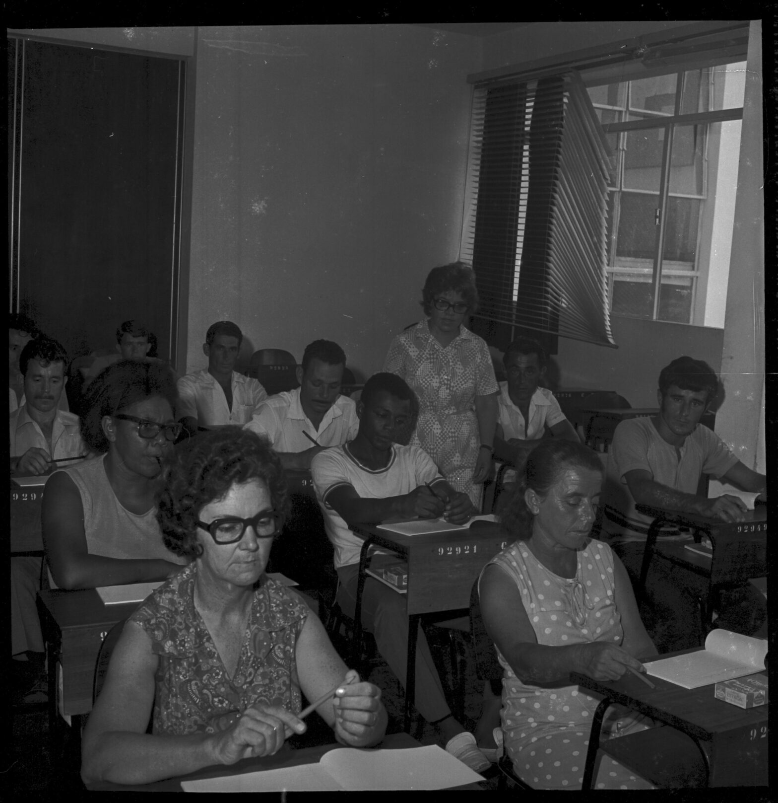 Onze alunos sentados em cadeiras e professora em pé no meio da sala. As duas alunas da frente estão segurando um lápis e olhando para o caderno a frente.