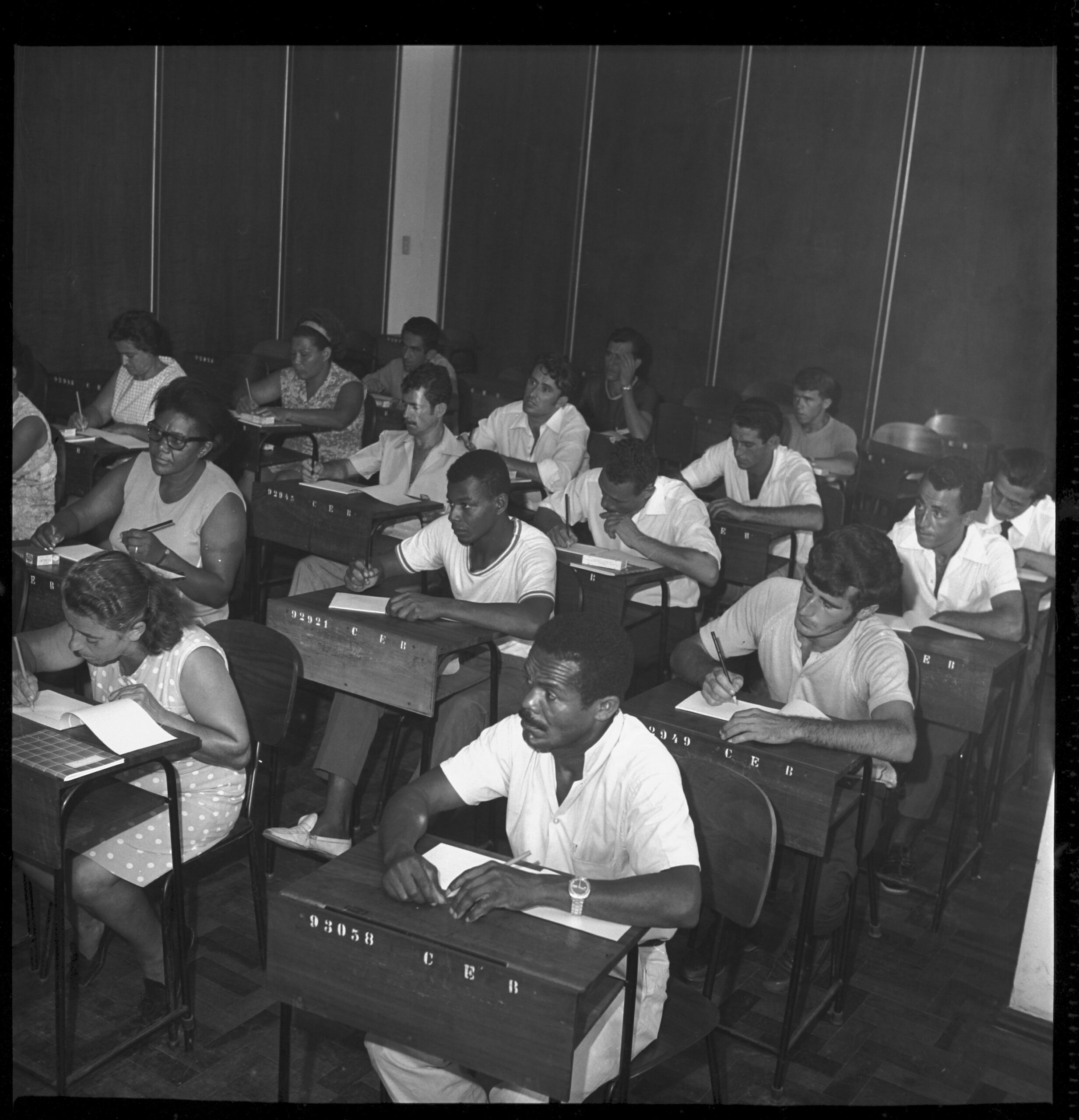 Dezessete alunos sentados em cadeiras. Todas as cadeiras possuem números identificatórios.