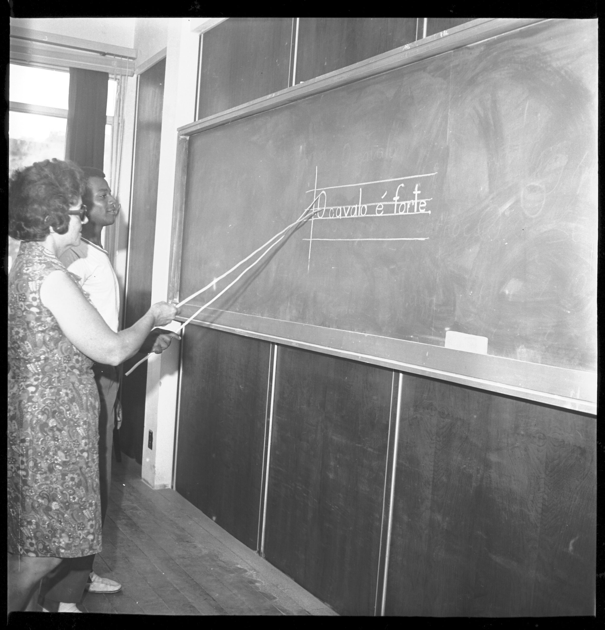 Da esquerda para a direita, há duas pessoas em pé. Ambas estão segurando uma vareta apontando para o escrito "O cavalo é forte" no quadro negro.