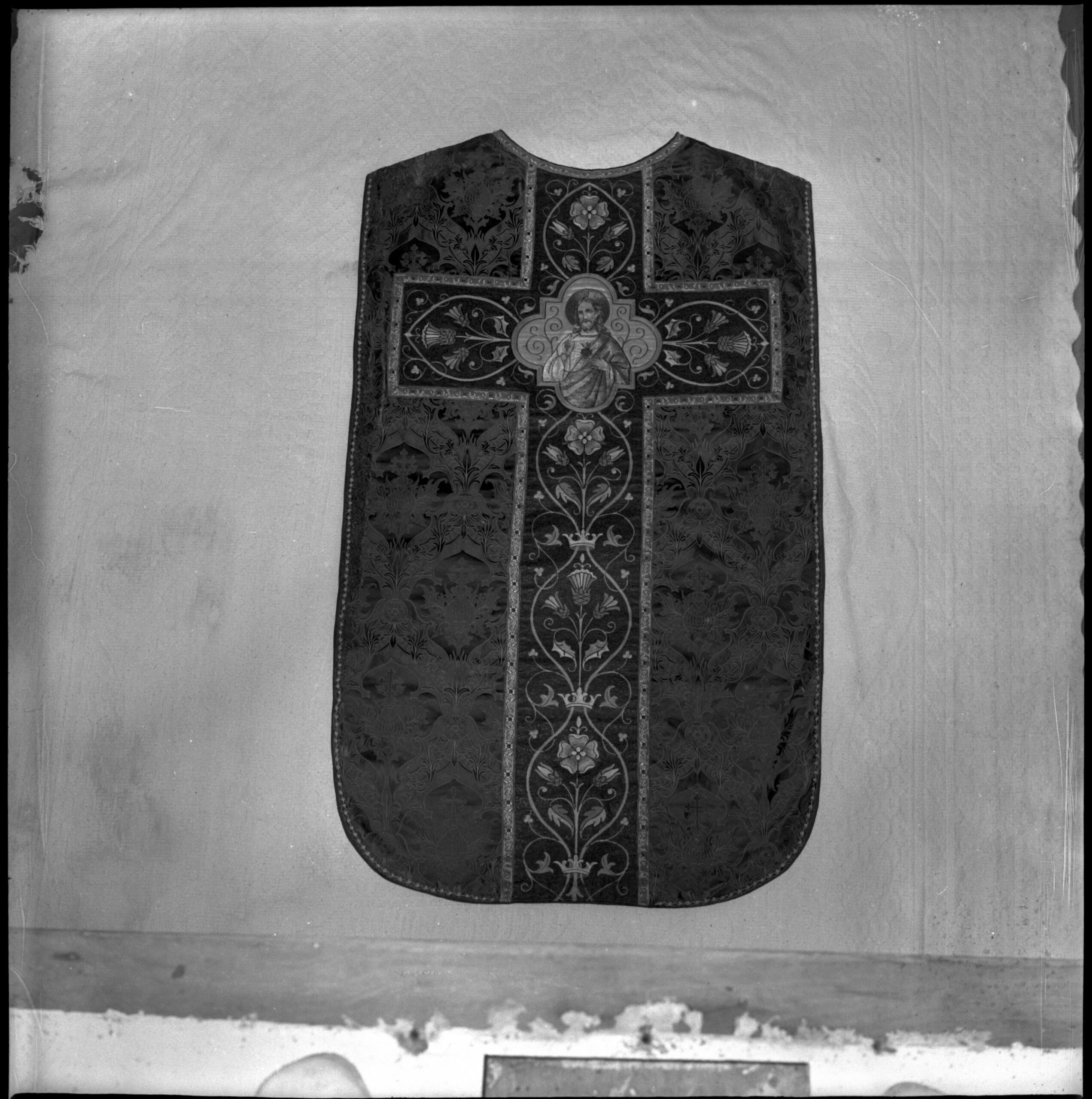 Ao fundo vemos um tecido branco com costuras na diagonal formando diversos triângulos, também possui ondulações na borda direita. À esquerda há um rasgo no tecido. O tecido central é uma veste litúrgica. Ela têm o formato oval com um corte na extremidade central superior. No centro da vestimenta há uma cruz. Nas extremidades, esquerda e direita, da cruz há desenhos de flores e folhas semiabertas. O centro da cruz está Jesus Cristo. O corpo da cruz há flores abertas e fechadas, entre um desenho e outro há coroas.