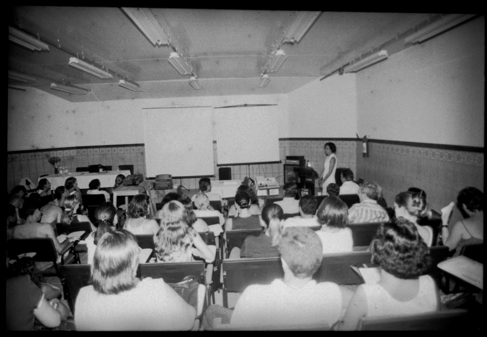 Em segundo plano, da direita para a esquerda, está Nilcéa em pé. Ao lado dela há um extintor de incêndio. Em primeiro plano estão os ouvintes, sentados.