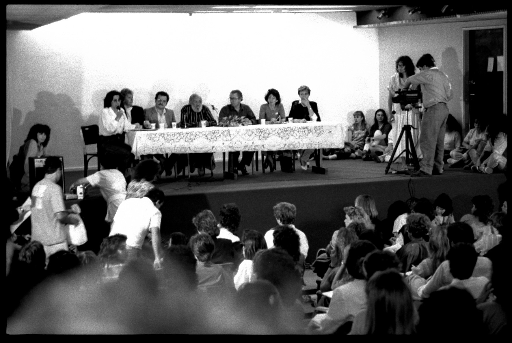 O Educador Paulo Freire veio a convite encerrar o Curso de Especialização em Alfabetização. Foi um encontro promovido pelo Centro de Educação sob a Coordenação da professora Figueiredo Cardoso Silva. Em segundo plano há uma bancada compondo sete pessoas. Da esquerda para a direita: 1 - mulher não identificada, falando no microfone, 2 - mulher não identificada sentada, 3- homem não identificado sentado, 4 - Paulo Freire sentado segurando um copo, 5 - homem não identificado, 6 - mulher não identificada, 7- mulher não identificada. Sentadas no chão, ao fundo, há duas mulheres. A frente há uma câmera, em um tripé e duas pessoas ao lado. Um homem está manuseando a câmera.