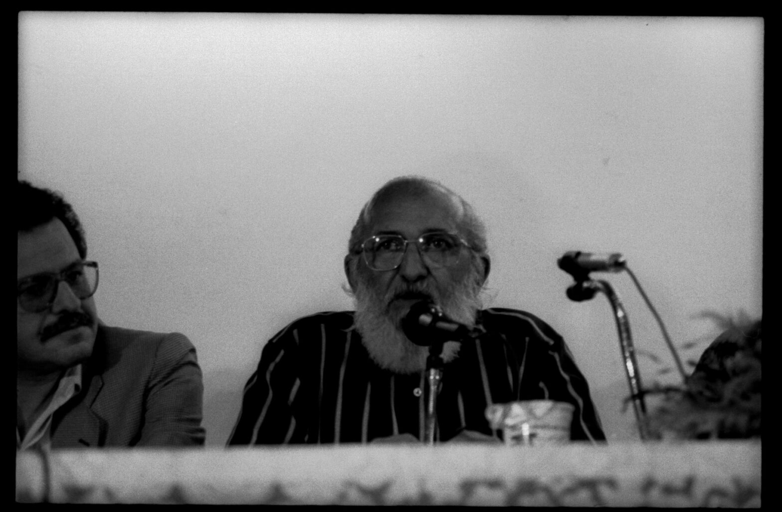 O Educador Paulo Freire veio a convite encerrar o Curso de Especialização em Alfabetização. Foi um encontro promovido pelo Centro de Educação sob a Coordenação da professora Figueiredo Cardoso Silva. Educador Paulo Freire em palestra na UFSC. Da esquerda para a direita há um homem não identificado.