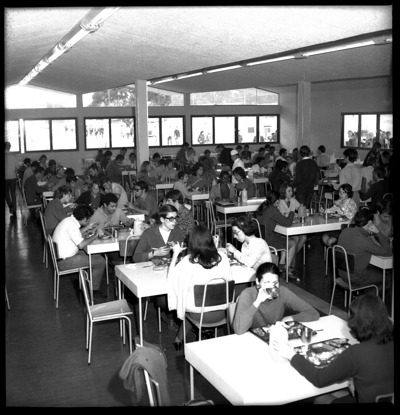 A imagem retrata vários alunos da UFSC almoçando. Os estudantes estão sentados em cadeiras e a frente deles está a bandeja do almoço e copos e garrafas na mesa. Da direita para a esquerda, em segundo plano, há pessoas em pé procurando um lugar para sentar. Em segundo plano há um funcionário em pé, vestido com o uniforme, e a frente dele há um homem negro sentado sozinho. Olhando para fora, pelas janelas, da direita para esquerda, é possível ver pessoas formando fila no exterior do Restaurante Universitário. Da esquerda para a direita, olhando pelas janelas, é possível ver pessoas andando em direção ao Restaurante Universitário.